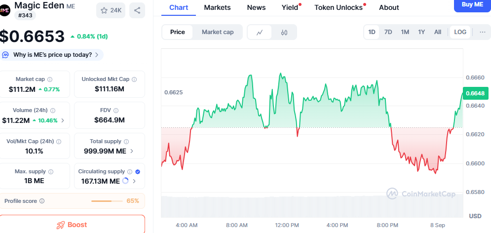 Magic Eden ended the day at $0.6653, rising 0.84%. The market capitalization reached $111.22 million, supported by a circulating supply of 167.13 million ME. Humanized Text: