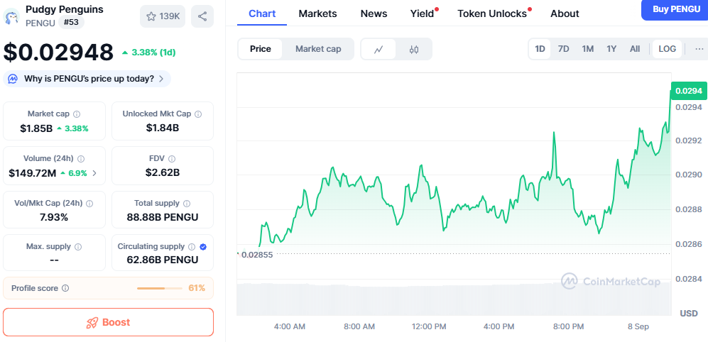 - Pudgy Penguins climbed 3.38%, hitting $0.0295 with rising liquidity and renewed buying pressure supporting continued upside momentum.
