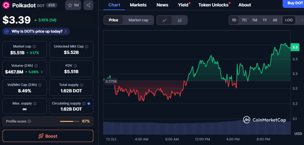 Polkadot traded at $3.39, rising 3.15% in 24 hours, marking a firm upward shift within the broader digital asset landscape. Its market capitalization reached $5.51 billion, reflecting a 3.17% daily improvement and signaling sustained participation across multiple exchanges. Meanwhile, 24-hour trading volume increased 5.09% to $467.8 million, showing growing activity and renewed confidence in DOT’s network performance.