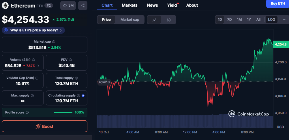 Ethereum remained stable and strengthened its dominance as the second-largest cryptocurrency by market capitalization. It traded at $4,254.33, rising 2.57% in 24 hours, and maintained its strong market position. Its market capitalization stood at $513.51 billion, up 2.54%, showing sustained traction within decentralized applications and DeFi activity.