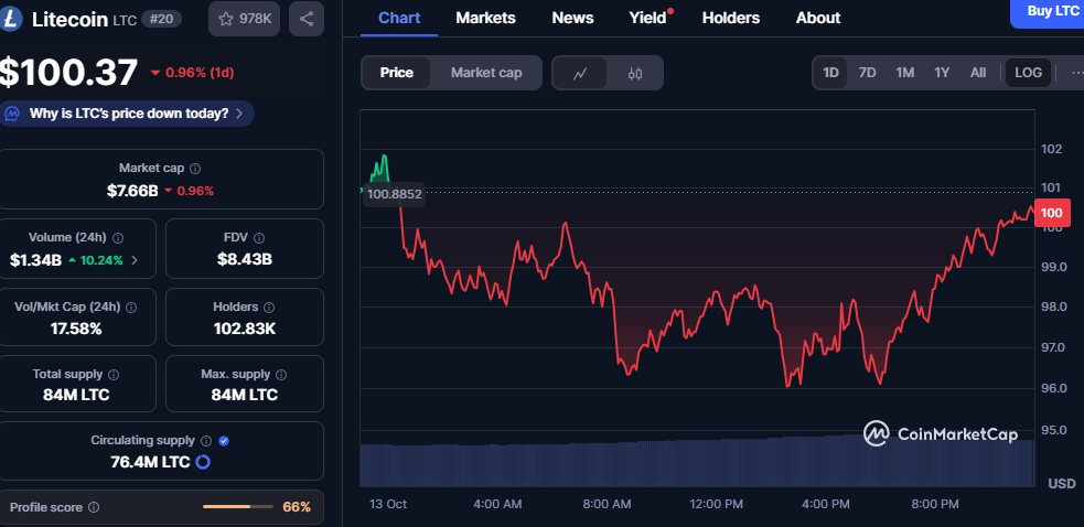 Litecoin traded at $100.37, marking a 0.96% decline over the last 24 hours, showing mild downward movement within stable ranges. Its market capitalization settled at $7.66 billion, mirroring the same percentage drop, yet the asset remained active across global markets. Meanwhile, the 24-hour trading volume rose 10.24% to $1.34 billion, highlighting persistent engagement and increased short-term repositioning.