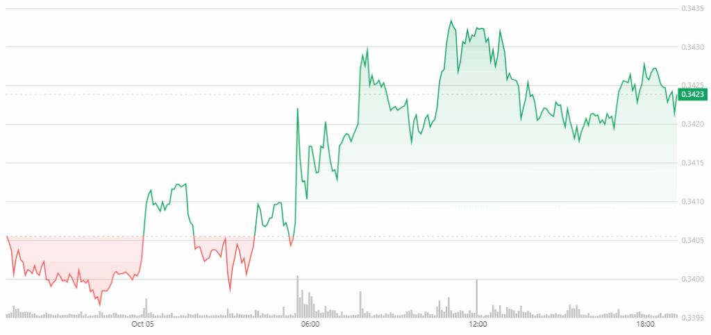 The price of TRON increased slightly by 0.68 percent and stood at $0.3424, with a 24-hour high of $0.3433 and a low at 0.3396. The chart indicates that TRX experienced a slight pressure on the downslope change at the start of the day, and then increased gradually, which reflects positive buying perspectives in the area of the support zone of 0.34. The market capitalization is 32.4 billion, placing TRON ninth in the general list, with robust 452 million of 24-hour trading volume.