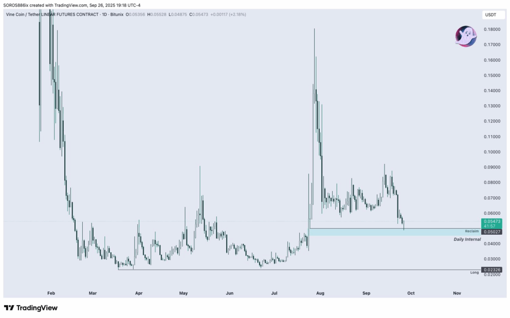 Vine Coin has struggled to sustain momentum since then . It now trades around $0.054, just above a key support zone near $0.05. This area—labeled as “Reclaim” and “Daily Internal” on charts—is a critical threshold. Holding above it could signal price stability, but falling below may trigger a deeper slide toward the $0.023 support.