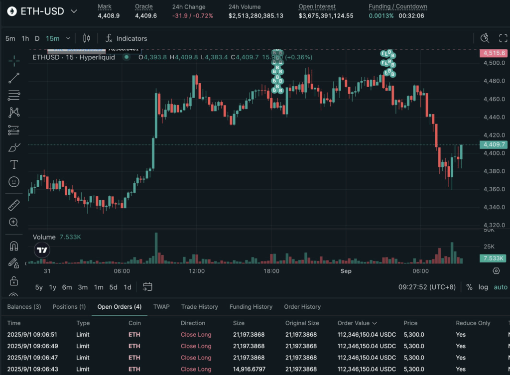 This increase raised the total position value further, consolidating the whale’s stance on Ethereum. Open orders reveal profit-taking targets positioned well above current trading levels. At least four limit sell orders remain set at $5,300, marked reduce-only, and distributed in increments of 21 ETH and 14 ETH.