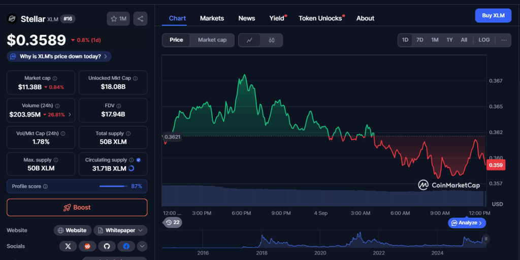 A look at the current price trend at the time of writing this article reveals that XLM traded at $0.3589, recording a 0.8% decline over the last 24 hours. Market capitalization stood at $11.38 billion, while 24-hour trading volume reached $203.95 million, down 26.81%. The trading session opened near $0.3621 before showing upward momentum in early movements. By mid-afternoon, the price reached levels close to $0.367, marking the session’s strongest point.