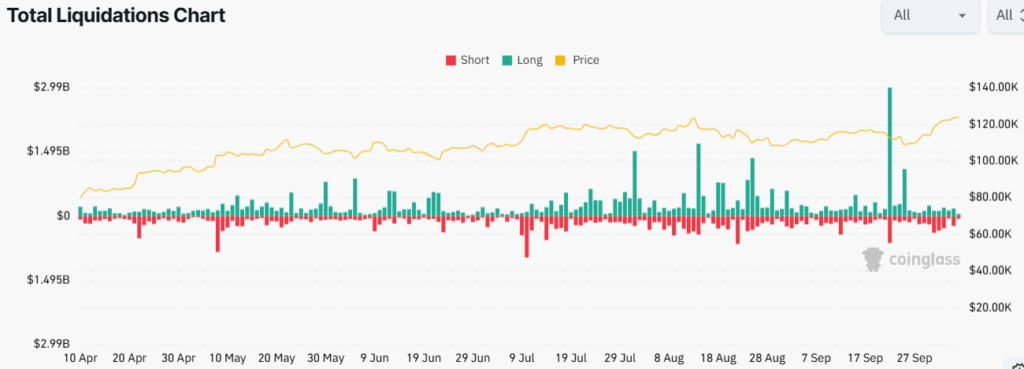 Coinglass liquidation data reveals frequent spikes in both long and short liquidations during late September and early October. The largest outflows occurred alongside price fluctuations above $120K, showing active derivatives positioning.