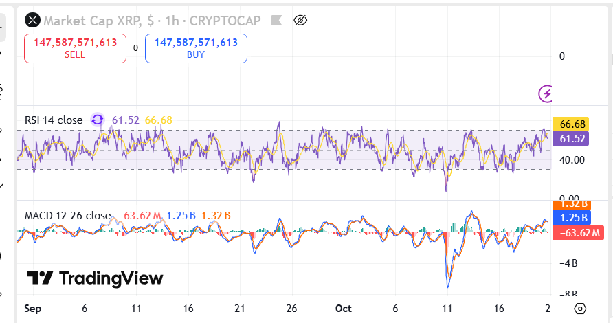 The Relative Strength Index (RSI) of the hourly chart lies at 66.09, a bit above the neutral area. This reading implies an upward trend with XRP moving towards short term overbought states. The MACD indicator in the meantime indicates a positive movement and the values are in the range of 1.33B, indicating the strengthening of short term demand.