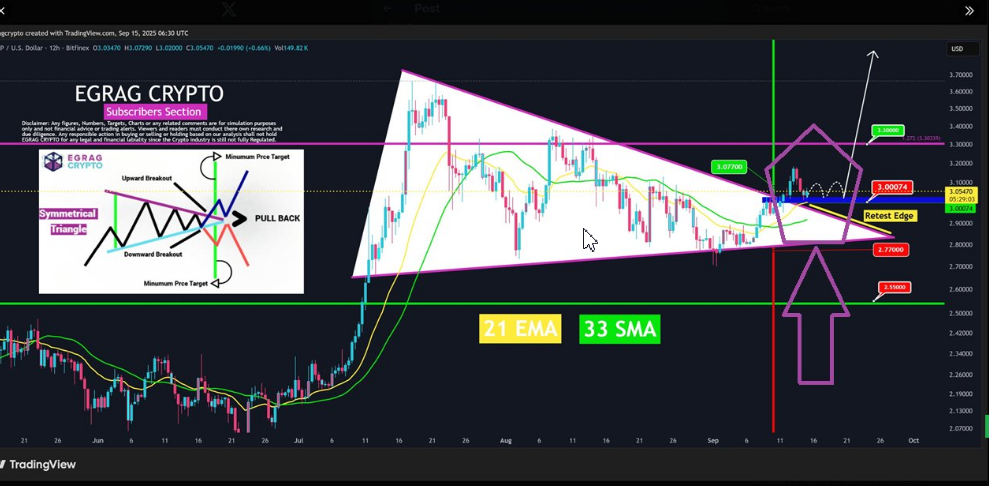 The current chart structure outlines a symmetrical triangle, which has contained price action across recent sessions. XRP trades inside this range with pressure building near the apex. As long as the asset holds the $3.00 level on daily and three-day time frames, the setup remains intact.